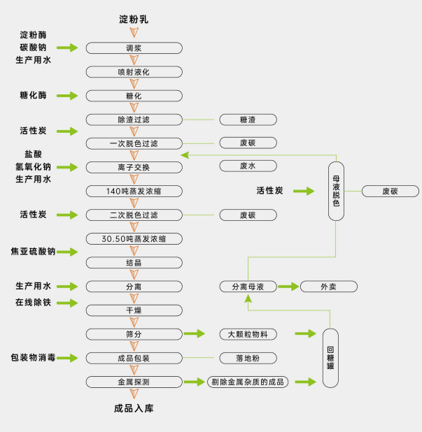 工藝流程:澱粉-調漿(jiāng)-糖化-中和-第一次脫色過濾-離子交換-第一次濃縮-第二次脫色-過濾-第二次濃縮-成品。